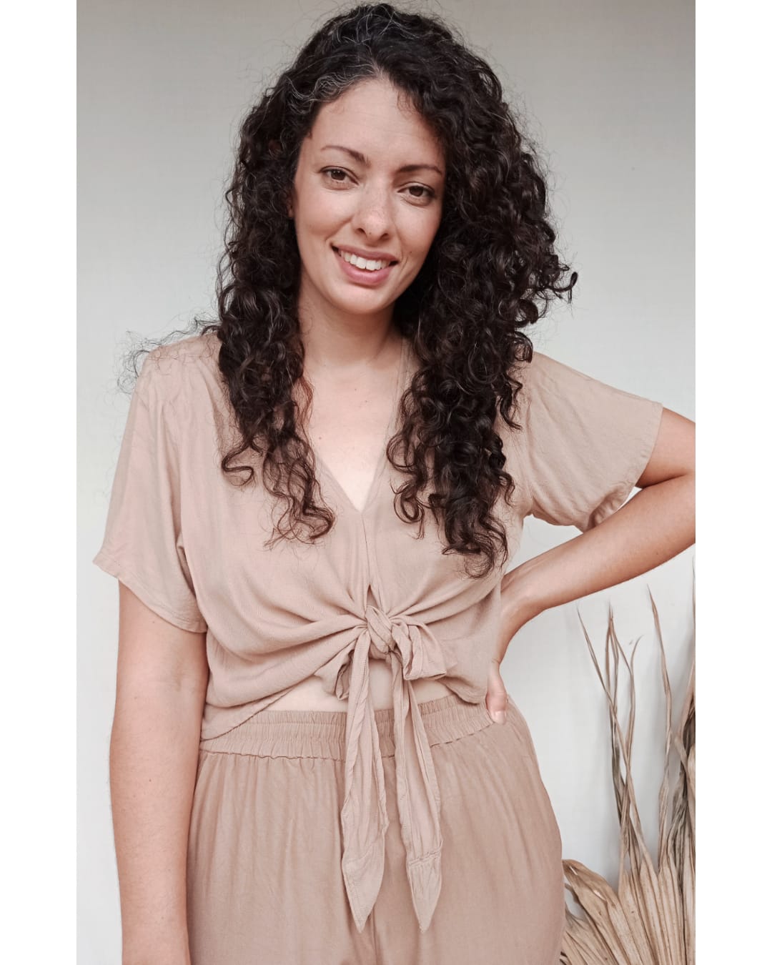 Usamos nas nossas produções a viscose sarjada, que é um tecido misto, é super leve e ótimo para o verão, pois é de facil transpiração. Molhamos todos os tecidos antes da confecção da peça para evitar o encolhimento da primeira lavagem